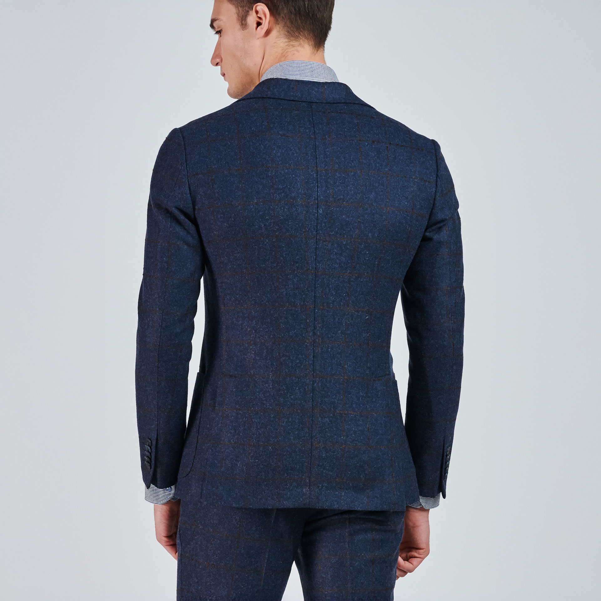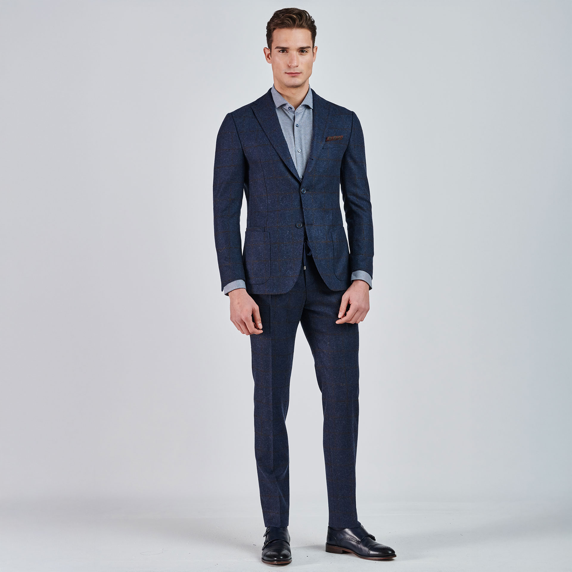 Mono yaka ve iki düğmeli ekose desen detayıyla öne çıkan takım ceketi, torba etek cep ile tamamlıyor. Pantolonu ile birleşen bu kombin, modern ve şık bir görünüm vaat ediyor.